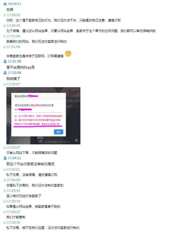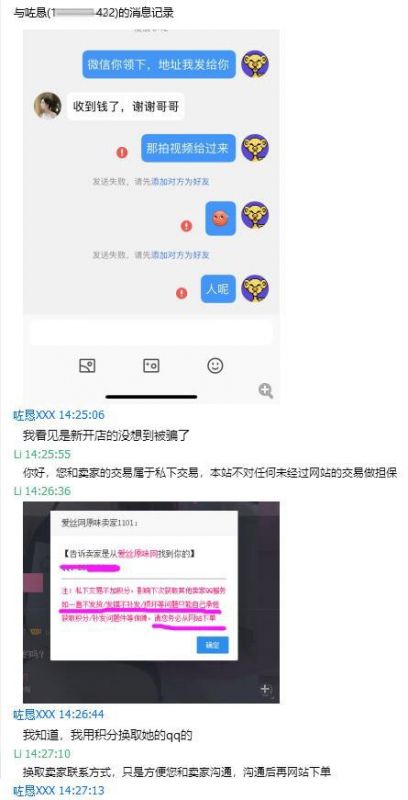 近期有多名顾客向客服反应,因获取某些店铺卖家的QQ沟通购买事宜,但没有从网站走单,私下付款后被卖家拉黑。